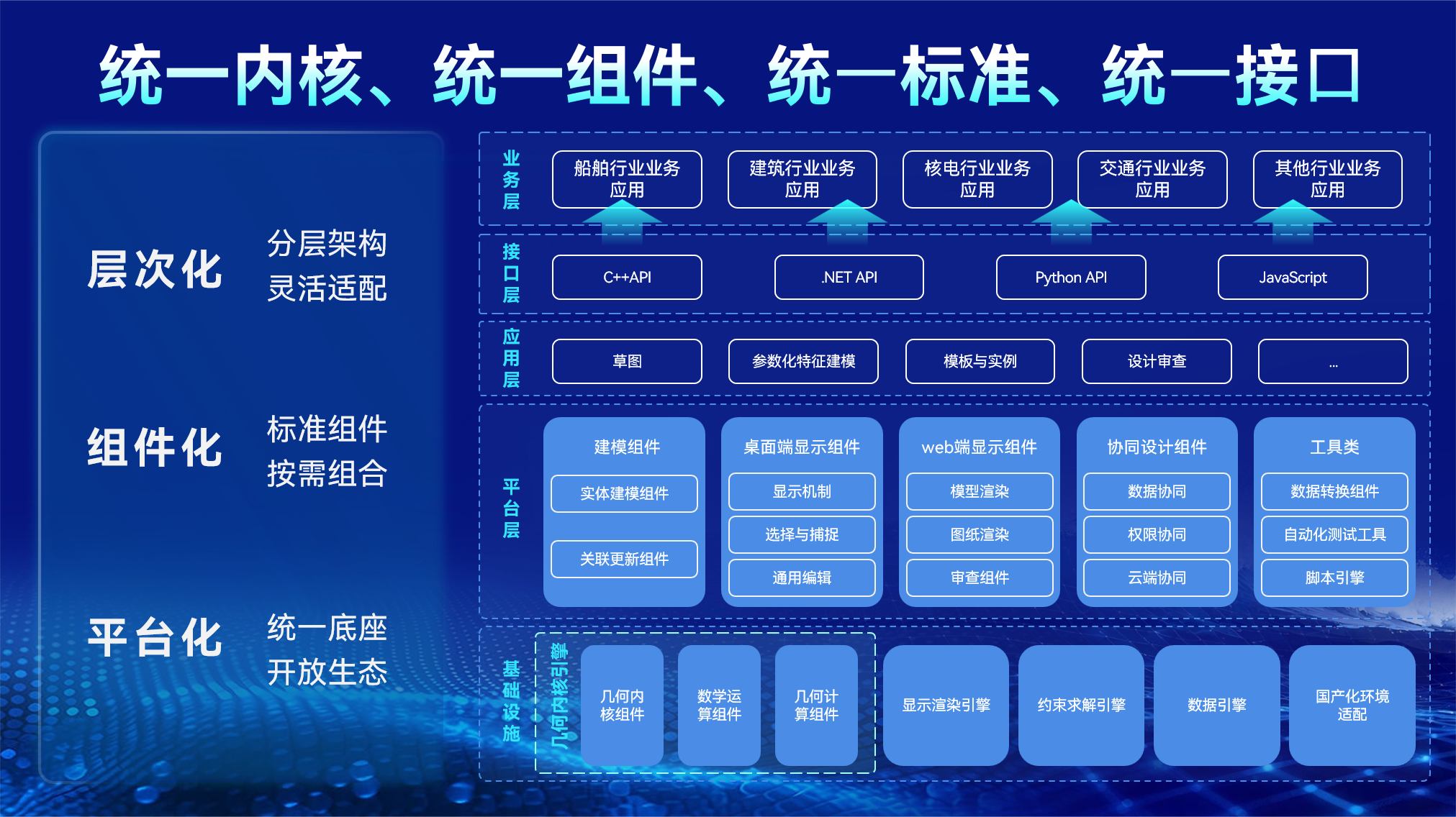 平台确立了:统一内核、统一组件、统一标准、统一接口的体系化架构。