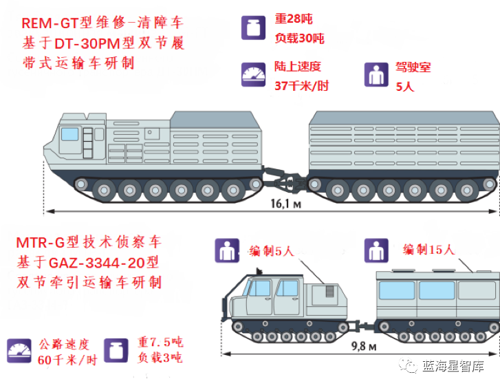 俄罗斯消息报于2021年12月3日报道,俄罗斯国防部对外表示,在北极地区组建专业化维修-清障编队的决议已经通过,该编队将列装可在低于-50℃环境中使用的REM-GT和MTR-G型特种车辆。