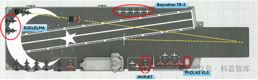 该航母长285米,宽72米,吃水10.1米,排水量6万吨;采用燃-燃联合动力系统,配装4台LM2500燃气轮机,最大航速25节;配装32单元MIDLAS垂直发射系统、4座“哥德尼兹”(Gökdeniz)近防武器系统;设有2条起飞跑道、1条着舰跑道;采用模块化滑跃甲板,最终将采用土耳其国产弹射系统取代模块化滑跃甲板;可搭载50架舰载机,其中20架搭载于飞行甲板上、30架搭载于机库内,随着项目进展,舰载机数量可能进一步增加;舰载机型号将包括海军型Hurjet轻型攻击机、“安卡”-3无人机、“红苹果”无人机、TB-3无人机,海军型“可汗”战斗机也可能在舰载机备选清单内,但目前还未证实。
