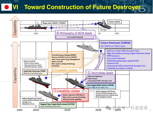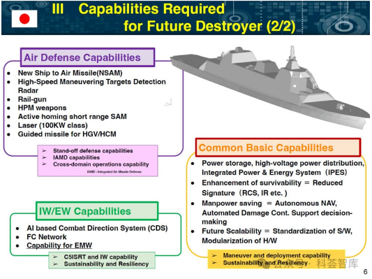 新型驱逐舰将以防空和电子战为核心任务,具备一体化防空反导、反高超能力。其概念设计将借鉴“朝日”级驱逐舰和“最上”级护卫舰,采用紧凑型舰体设计,进一步提高隐身性和自动化水平;同时,将集成综合电力与能源系统(高压配电)、无人系统、高能武器、人工智能等先进技术,提高在反介入/区域拒止环境中的生存和作战能力。此外,新型驱逐舰具备较大改装裕量,可为后续技术更新、集成新装备奠定基础,满足持续升级、兼容性、拓展性需求。